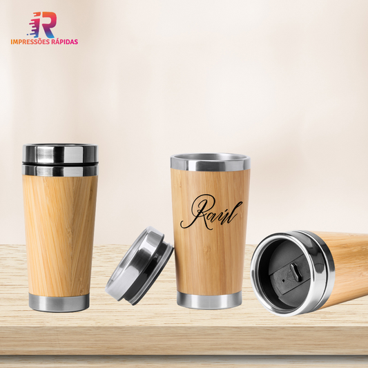 Caneca de parede dupla em aço inoxidável com exterior em bambu