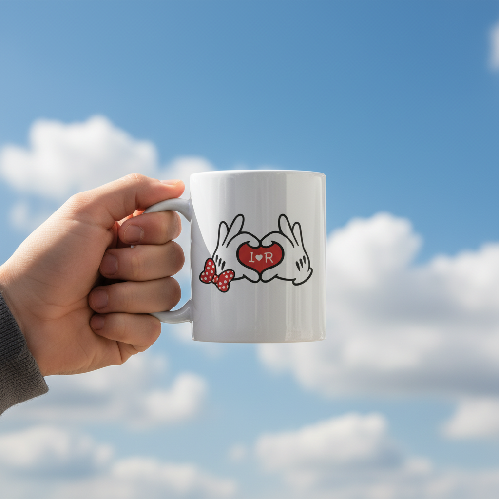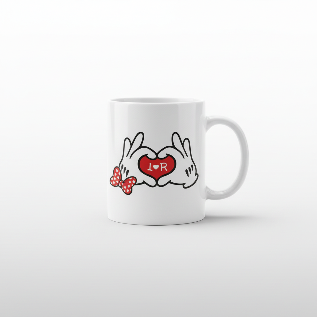 Celebre o amor com esta caneca especial, com ilustração de duas mãos em estilo desenho animado formando um coração com as inicias do casal no interior.