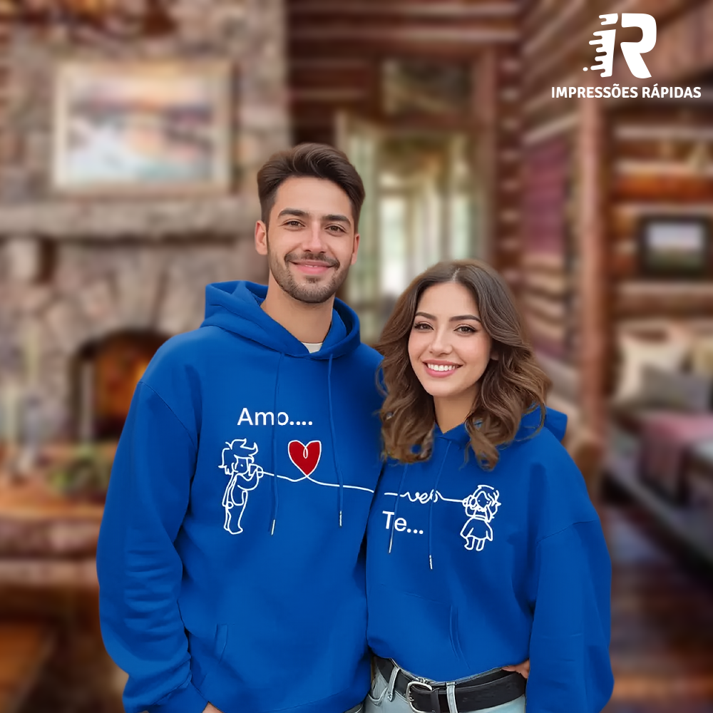 O design inteligente divide a mensagem "Amo-te" entre as duas hoodies, simbolizando que o amor só se completa quando estão juntos. As ilustrações de um rapaz e uma rapariga ligados por um fio que forma um coração representam a conexão profunda e o laço que une o casal.