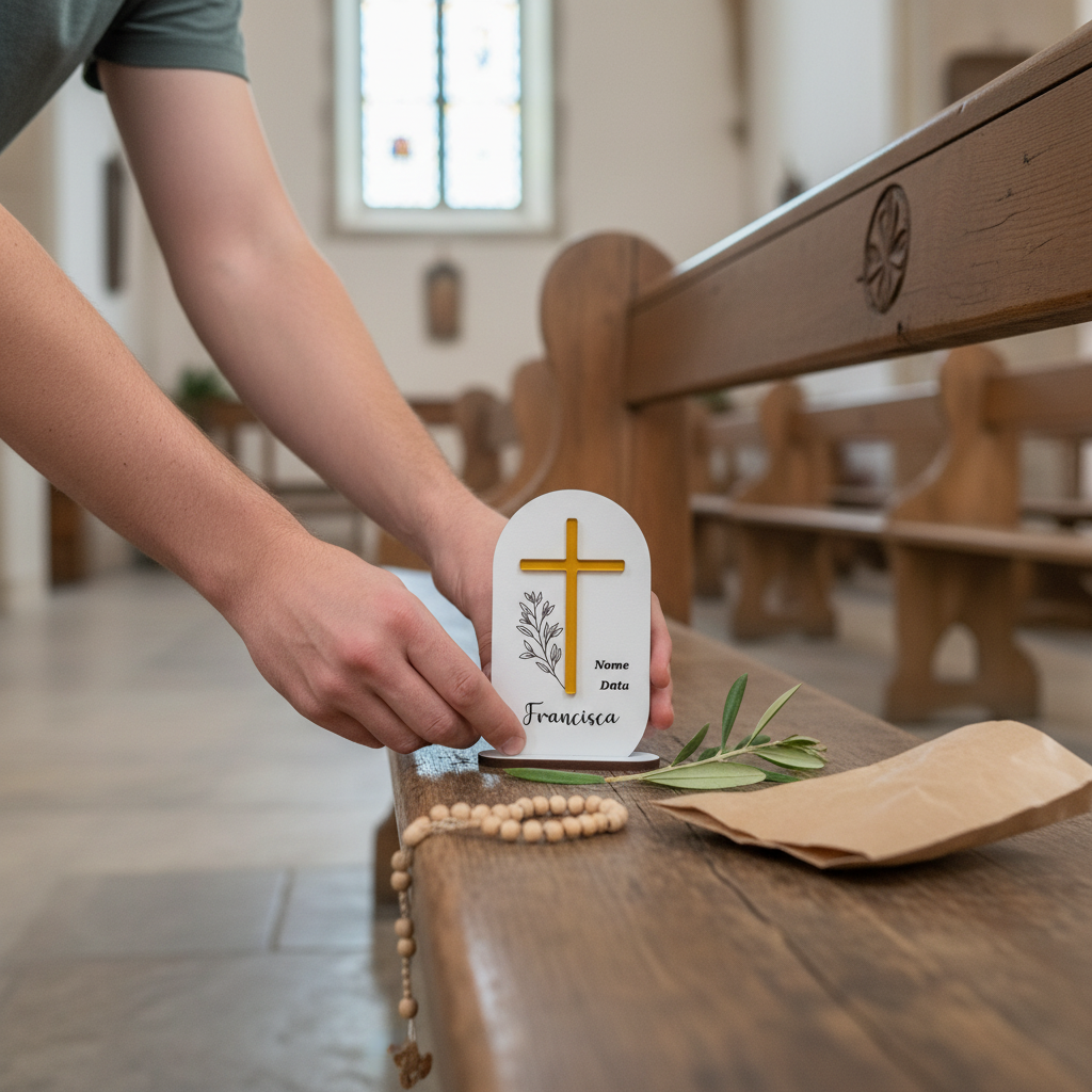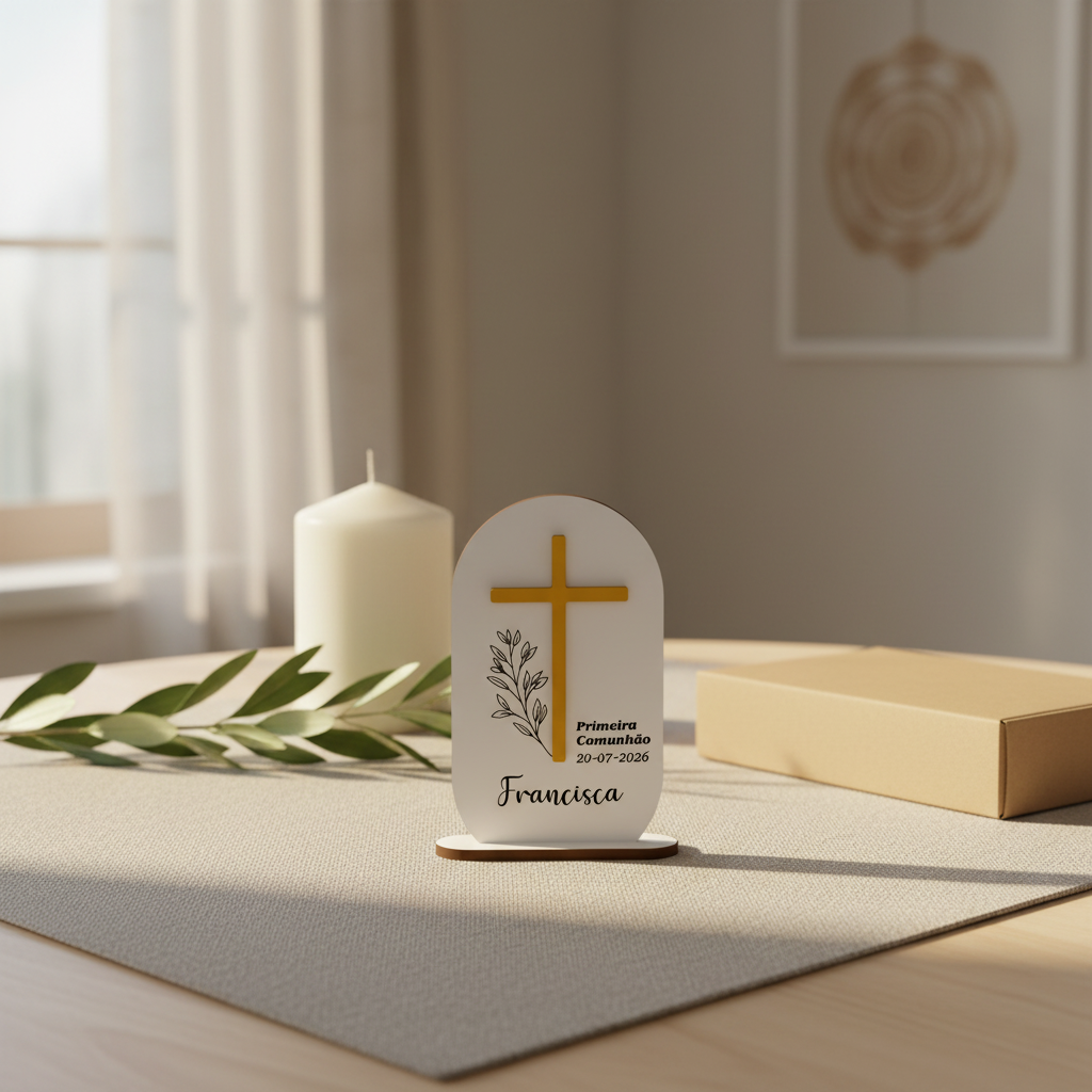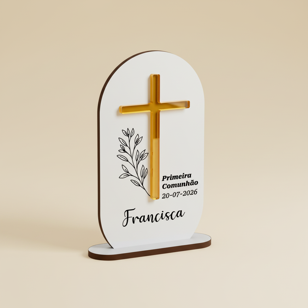 Celebre momentos especiais com esta elegante lembrança de batismo ou primeira comunhão em MDF branco.